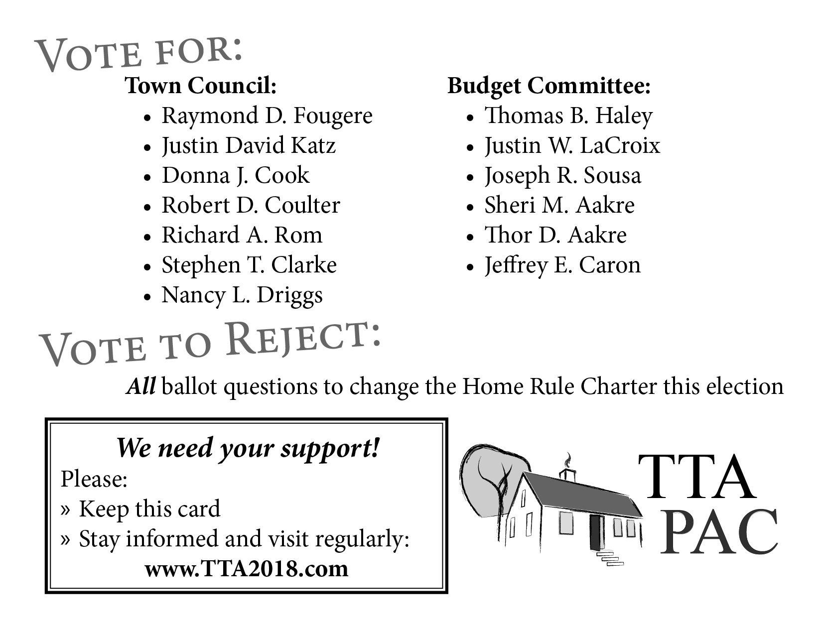 Vote for the TTA slate of town council and budget committee candidates.