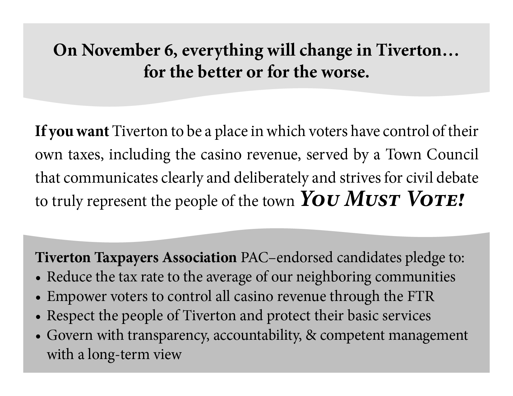 Now more than ever Tiverton needs a new Town Council which will embrace good government and respect the voters. And I believe the voters, not the Town Council, should keep their FTR rights and decide if casino revenue can be used to lower taxes. Stop the power grab.