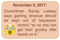 It is no wonder Councilor Lebeau said gaming revenue should be kept out of taxpayers’ control “so no one can get their grubby little hands in it.” If the FTR taxpayer petition was successful at lowering taxes, then the TC would not get its slush fund – quite simple.
